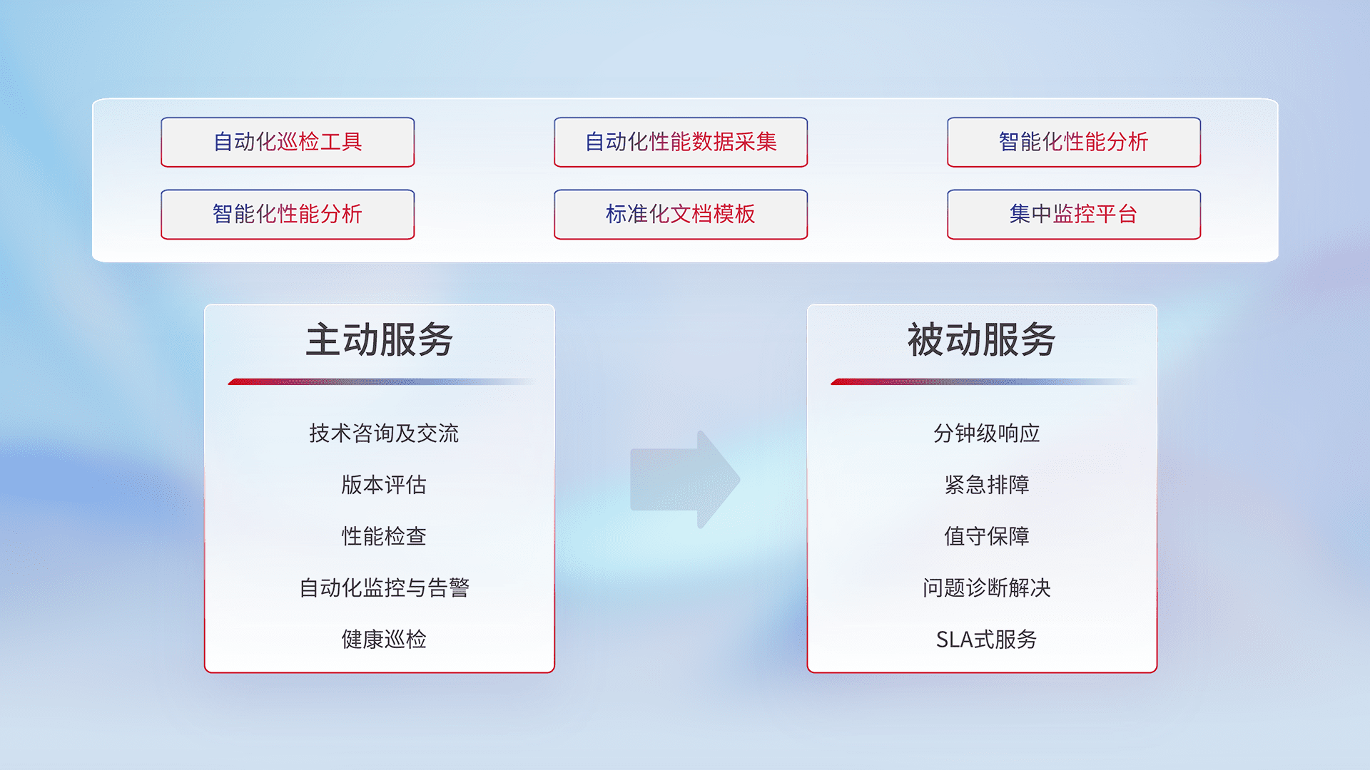 智能化工具和标准化文档,,,保障服务质量,,,,提供主动服务(包含技术咨询、、、、版本评估、、性能检查、、、自动化监控与告警、、健康巡检)和被动服务包含(分钟级响应、、、紧急排障、、、、值守保障、、、、问题诊断解决、、SLA服务)。。。。